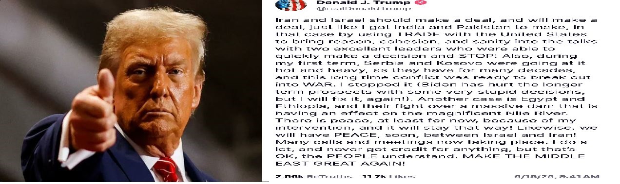 وكتب ترامب، "مثال آخر هو مصر وإثيوبيا وصراعهما حول سد ضخم يؤثر على نهر النيل العظيم"، وأن "هناك سلاما حاليا، على الأقل حتى الآن، بفضل تدخلي، وسيبقى كذلك!".