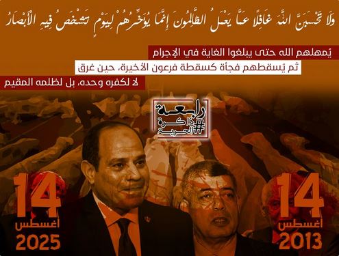 تفاعل ناشطون ومنصات منها "تيم المرابطون" مع هاشتاج #رابعة_ذاكرة_الحرية، حيث تتزامن الذكرى الثانية عشرة للفضّ الدموي لاعتصامي رابعة العدوية والنهضة في القاهرة هذا العام، مع إضراب عن الطعام داخل سجن "بدر 3" سيئ الذكر احتجاجاً على ظروف احتجاز لا إنسانية، تشمل منع الزيارات، والتريض والتعرّض لأشعة الشمس ما يسبب تدهوراً جسدياً ونفسياً حاداً، وحجب المراسلات فضلا عما يحدث في غزة من تجويع وإبادة جماعية برعاية صهاينة العرب والأمريكان.
