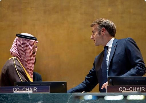 ويساند ماكرون في إعادة طرح دولة فلسطين وحل الدولتين ولي العهد السعودي محمد بن سلمان وكان أمام انتقاد بأنه متسمر في خيانة القضية الفلسطينية، حيث ليس هناك دولتين هناك فقط فلسطين صاحبة حق الدولة و"إسرائيل" كيان معتد احتلال ليس له الحق البقاء على أرض فلسطين.