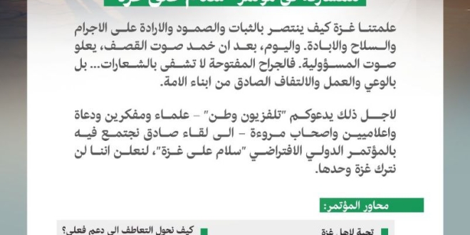 ينظم تلفزيون وطن مساء اليوم الأحد مؤتمراً دولياً افتراضياً في تمام الساعة الثامنة بتوقيت القاهرة، تحت عنوان "سلام على غزة"، بمشاركة نخبة من العلماء والمفكرين وقادة الرأي من مختلف الدول الإسلامية.