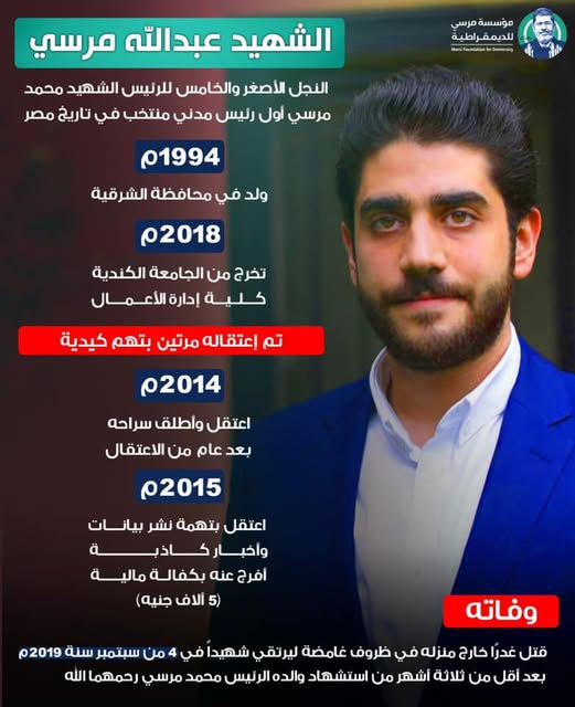 وفي الرابع من سبتمبر قضى نجل الرئيس الشهيد الدكتور محمد مرسي، أول رئيس مدني منتخب في تاريخ مصر الحديث شاباً يافعاً مؤمناً بقيم الحرية والعدالة، ثابتاً على مواقف أبيه – رحمهما الله  -.وقد أوصى قبل رحيله بتدشين مؤسسة تحمل اسم والده، تحمل منهجه وأفكاره، مؤمنة بقيم الديمقراطية، وحاضنة للأمل في مستقبل يليق بمصر وأبنائها.