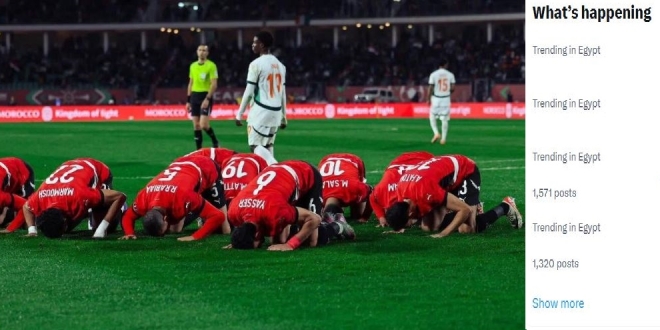 فاز منتخب مصر لكرة القدم على منتخب كوت ديفوار 3 -2 وتأهل إلى نصف نهائي كأس الأمم الإفريقية ليواجه السنغال الأربعاء القادم وتصدر هاشتاج "#منتخب_الساجدين" منصة (إكس) ضمن احتفال النصر بالسجود بعد احراز محمد صلاح هدف الفوز..