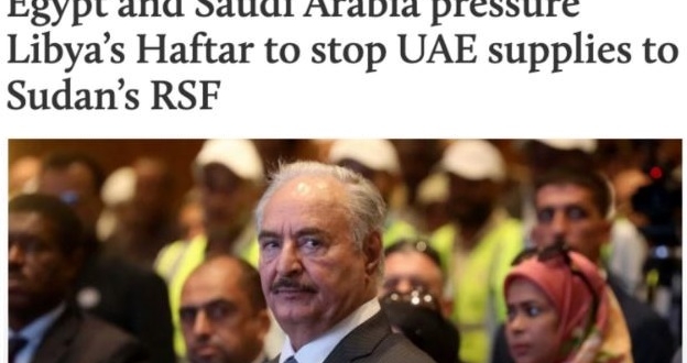 وبحسب تقرير موقع "ميدل إيست آي"، فإن مصر والسعودية تمارسان ضغوطًا متزايدة على خليفة حفتر بسبب دوره في تسهيل الدعم العسكري الإماراتي لقوات الدعم السريع السودانية. هذا الضغط يأتي ضمن جهد أوسع لمنع تدفق الأسلحة والوقود والمقاتلين إلى قوات الدعم السريع، والحد من نفوذ الإمارات في المنطقة، خاصة على طول المثلث الحدودي الحساس بين مصر وليبيا والسودان.