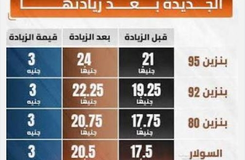 وأقرت حكومة السيسي زيادة قالت إنها "استثنائية" في أسعار المنتجات البترولية (البنزين والسولار) اعتباراً من 10 مارس 2026، وذلك بزعم : مواجهة الارتفاع الحاد في أسعار النفط العالمية نتيجة التوترات الجيوسياسية والحرب في المنطقة.