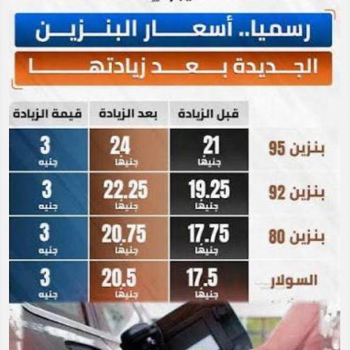 بنزين 80: ارتفع إلى 20.75 جنيه للتر (بدلاً من 17.75 جنيه).