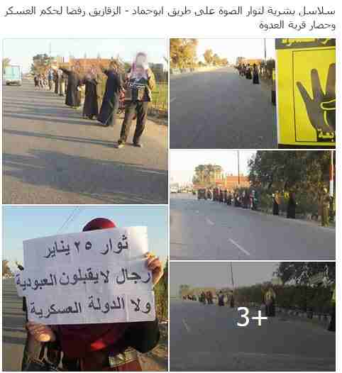 وخرجت المظاهرات بعد عصر اليوم وحتى قبيل المغرب من بركة السبع بالمنوفية والعامرية بالإسكندرية ويوسف الصديق بالفيوم وأبوحماد والزقازيق والتى شهدت عدة تظاهرات ؛ الأولى على طريق منيا القمح والثانية بقرية النخاس ، فضلا عن عدد من الوقفات على مداخل المدينة المتنوعة عاصمة محافظة الشرقية .