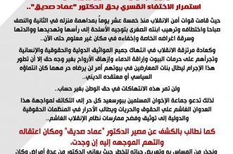 أدانت جماعة الإخوان المسلمين ببورسعيد استمرار إخفاء داخلية الانقلاب للدكتور "عماد صديق"، لليوم الخامس عشر على التوالي منذ اعتقاله من منزله. وقالت الجماعة، في بيانها، إن "قوات أمن ...
