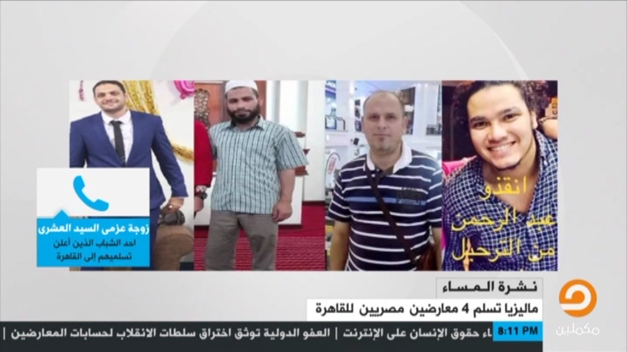 أكدت السلطات الماليزية تسليم 4 مواطنين مصريين إلى سلطات الانقلاب على خلفية اتهامات أمنية. وذكرت مصادر حكومية أن الشبان الأربعة، محمد فتحي وعبدالله هاشم وعبدالرحمن عبدالعزيز وعزمي السيد، ...