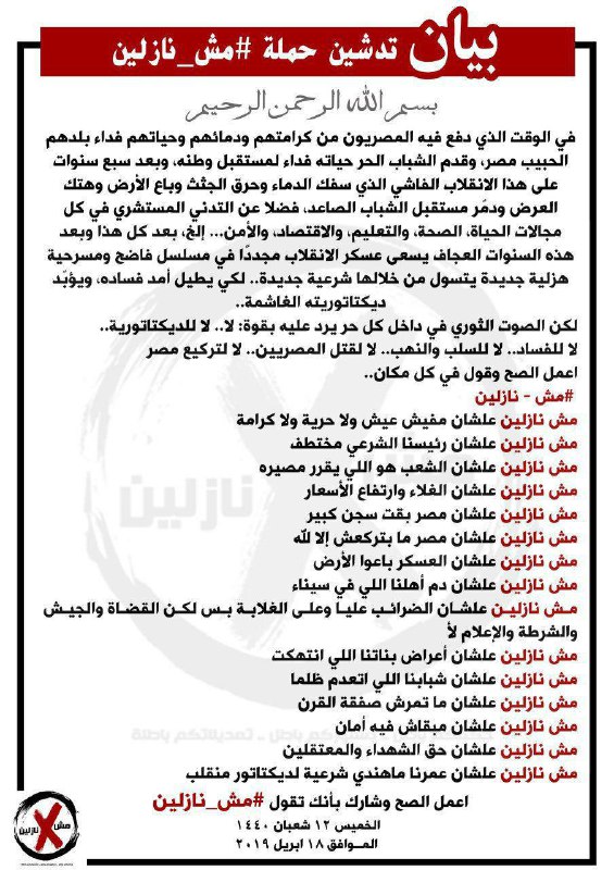 دشنت حملة #مش_نازلين على مواقع التواصل الاجتماعي انطلاقها معتبرة أن “لا” تنسحب على رفض الديكتاتورية الغاشمة، والسلب والنهب، وقتل المصرييين، وتركيع مصر ، والفساد. وقال بيان التدشين قال ...