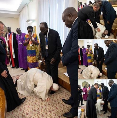 شاهد| لتأسيسه أول دولة نصرانية بجنوب السودان.. بابا الفاتيكان يسجد مُقبلًا قدم سلفاكير!