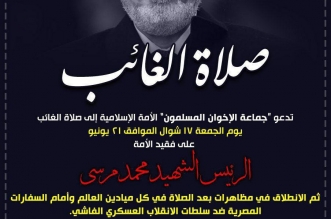 دعت جماعة الإخوان المسلمين جميع الشعوب العربية والإسلامية إلى المشاركة في صلاة الغائب على الشهيد البطل الرئيس محمد مرسي، يوم الجمعة المقبل. وناشدت الأحرار في كل بقاع العالم ...