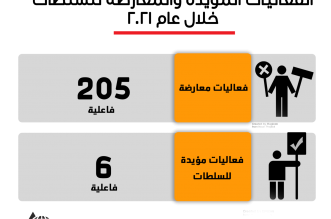 211 احتجاجا في 2021  للقوى السياسية المختلفة و131 انتهاكا للحريات الإعلامية و121 حكما بالإعدام