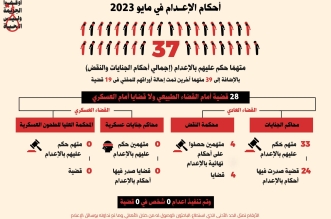 37حكما بالإعدام وإحالة أوارق 39 آخرين للمفتي خلال مايو الماضي