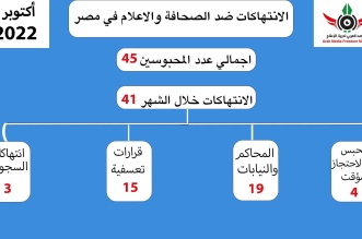 41 انتهاكا لحرية الإعلام والصحافة خلال أكتوبر واستمرار حبس 45 صحفيا وإعلاميا