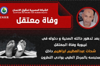 وثقت الشبكة المصرية لحقوق الإنسان استشهاد المعتقل "شحات عبد العظيم إبراهيم" من مدينة إدفو محافظة أسوان، نتيجة لما تعرض له من إهمال طبي داخل محبسه وعدم حصوله على حقه ...