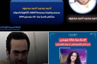 ضمن حملة "خرّجوهم كفاية كدة" وثقت الشبكة المصرية لحقوق الإنسان إخفاء قوات الانقلاب بمحافظة أسوان مدرس الرياضيات بمدرسة العقاد الثانوية بأسوان أحمد محمد أحمد محمود منذ اعتقاله في 20 ديسمبر 2019 أثناء ...