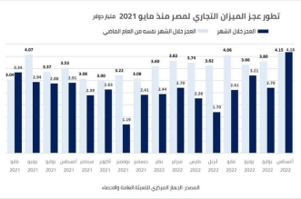 أوضحت بيانات جهاز التعبئة العامة والإحصاء، وصول قيمة العجز في الميزان التجاري لمصر إلى 4.18 مليار دولار، مقابل 4.15 مليار دولار خلال الشهر نفسه من 2021. وكشف البيانات، ...