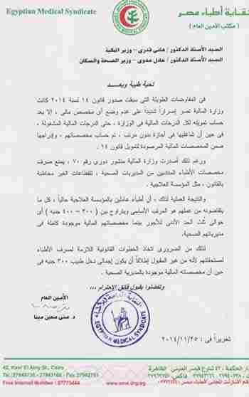 أرسلت نقابة الأطباء خطابا للدكتور هاني قدري، وزير المالية فى حكومة الانقلاب، والدكتور عادل عدوي، وزير الصحة الانقلابى، تطالبه باتخاذ الخطوات القانونية اللازمة لصرف مستحقات الأطباء، وأوضحت أنه ...