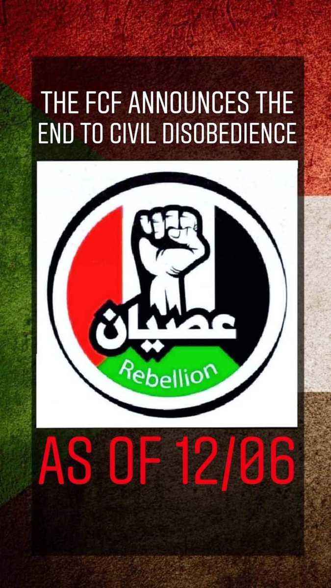 بعد ثلاثة أيام غير منقطعة من العصيان المدني في مدن السودان، قررت قوى إعلان الحرية والتغيير تعليق العصيان المدني والإضراب السياسي مؤقتًا مع نهاية 11 يونيو، لإعادة ترتيب هذه الأوضاع، بحيث تستمر المقاومة بشكل أقوى وأكبر، بحسب تجمع المهنيين الأحرار.