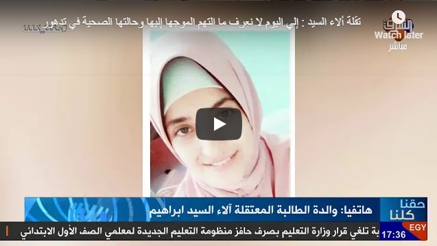 وقالت والدة آلاء، في مداخلة هاتفية لبرنامج “حقنا كلنا” على قناة “الشرق”: إن آخر زيارة لها كانت يوم الجمعة الماضي، وظهرت عليها حالة من الإعياء الشديد، وتعرضت للإغماء أكثر من مرة، وقامت الإسعاف بإفاقتها دون نقلها للمستشفى.