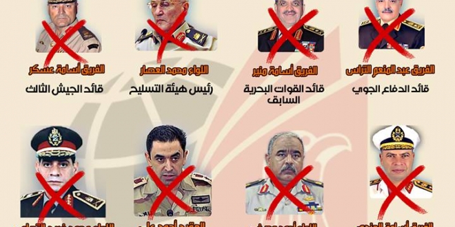 وقال الباحث العسكري محمود جمال: إن السيسي أقال 28 قائدا عسكريا ولم يبق إلا على 6 شخصيات حتى قبل عام انخفضوا إلى اثنين فقط ثم لم يعد منهم واحد من المجلس القديم، بعدما كان لصدقي صبحي الحق بإعطاء أوامر بتحريك القوات، ولقائد القوات الجوية يونس المصري.