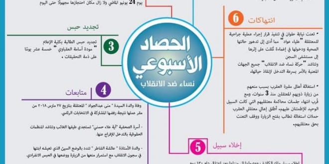 وثَّقت “حركة نساء ضد الانقلاب” جملة من الانتهاكات بحق المرأة المصرية في أسبوع، خلال الفترة من الجمعة ١٢ يوليو إلى الخميس ١٨ يوليو.