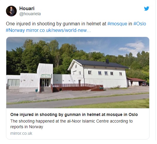 بدأت الشرطة النرويجية التحقيقات في هجوم إرهابي استهدف مسجد العاصمة أوسلو عشية عيد الأضحى المبارك. ووقع إطلاق النار في مركز النور الإسلامي في بلدة بيروم، وهي إحدى ضواحي العاصمة أوسلو. وقال إمام المسجد عرفان مشتاق لصحيفة بودستيكا المحلية إن "رجلا أبيض يعتمر خوذة ويرتدي زيا نظاميا أطلق النار على أحد أفراد جاليتنا". وروى أن "رجلا يبدو أنه نرويجي دخل المسجد مزودا ببندقية ومسدسات (…) وأخذ يطلق النار على من حوله".
