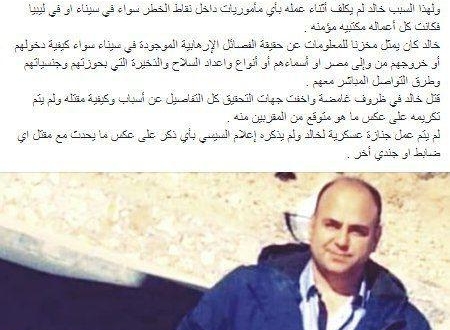 وكتب شرابي، عبر صفحته على فيسبوك: "في الثامن من هذا الشهر قتل العقيد خالد منصور نور الدين تمراز وشهرته خالد تمراز الضابط بالمخابرات الحربية"، مشيرا إلى أن "خالد هو ابن منشية القاضي مركز فاقوس محافظة الشرقية، وكان صديقا مقربا من محمود السيسي قبل اندلاع الثورة بعدة سنوات وحتى مقتله، ولهذا السبب خالد لم يكلف أثناء عمله بأي مأموريات داخل نقاط الخطر، سواء في سيناء او في ليبيا فكانت كل أعماله مكتبيه مؤمنة".