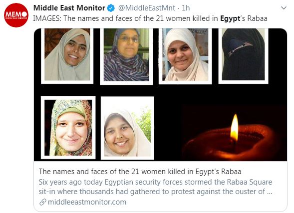 استعرض موقع “ميدل إيست مونيتور” البريطاني أسماء ووجوه نحو 21 امرأة قتلن في رابعة قبل ست سنوات، بعدما اقتحمت قوات الأمن المصرية اعتصام ميدان رابعة؛ حيث تجمع الآلاف للاحتجاج على الانقلاب على أول رئيس منتخب ديمقراطيا في مصر محمد مرسي.