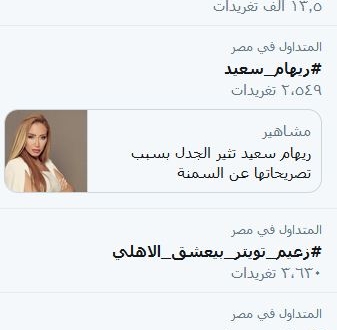 تصدر هاشتاج “#ريهام_سعيد” قائمة الهشتاجات الأكثر تداولا عبر موقع تويتر، رفضا لتطاول الإعلامية الانقلابية ريهام سعيد على ذوي السمنة من المصريين، مؤكدين ضرورة التصدي لإساءات وتطاول الأذرع الإعلامية للانقلاب على الشعب المصري.