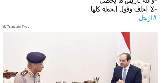 شارك العديد من النشطاء على هاشتاج #ارحل وهو واحد بين وسوم عدة منها #جمعة_الغضب و#الشعب_يريد_اسقاط_النظام و#sisi_out جميعها يؤشر إلى أن الجمهور والذي احتاط له السيسي على مدى 6 أعوام يريد أن يحضر مباراته النهائية وإطلالته الأخيرة ويأتي الهاشتاج #ارحل غير معطوف على لازمته التي تصدرت، وكانت الأعلى تداولا عشرات المرات خلال سنوات انقلابه على ثورة يناير بكل مكاسبها، وهي هنا بحسب النشطاء لأنه لا يستحق إلا ركلة واحدة وأنه أقل من أن يخاطب مجددا.