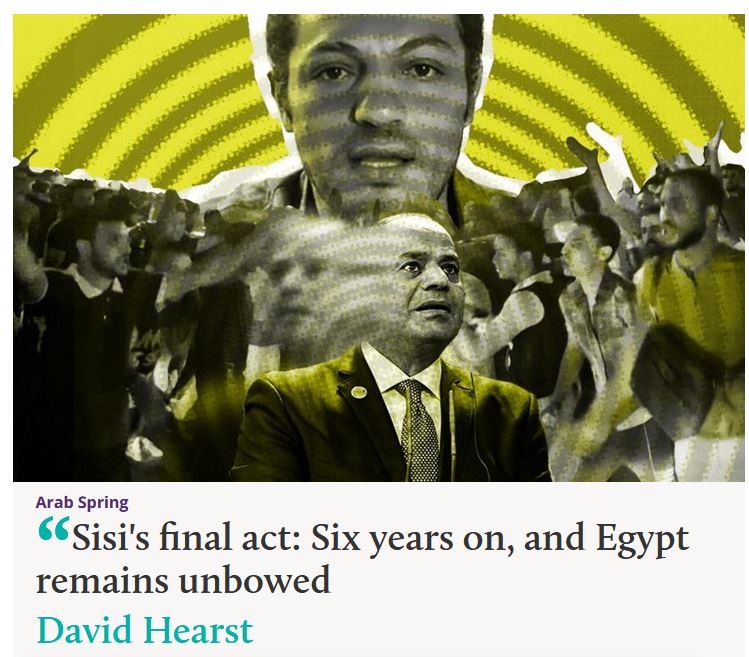 قال المحلل السياسي البريطاني ديفيد هيرست، مدير تحرير “مديل إيست آي”، في مقال بعنوان “الفصل الأخير للسيسي: بعد ست سنوات وما زالت مصر غير آبهة”: إن الديكتاتور السيسي أعاد نفس الظروف التي أشعلت الموجة الأولى من الربيع العربي في عام 2011، وإنه إذا اختار عبد الفتاح السيسي مهنة بديلة، فمن المؤكد أنه كان ينبغي أن يكون المسرح.