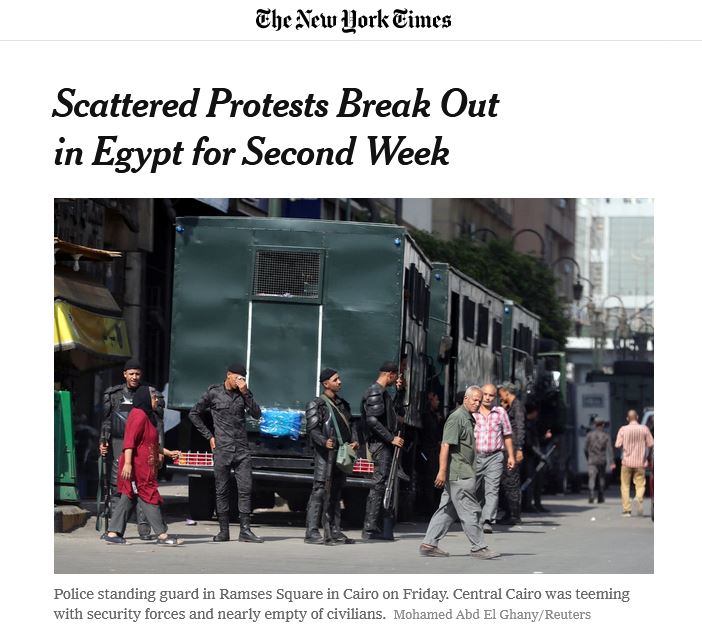 وقفت صحيفة “نيويورك تايمز” الأمريكية على وسط القاهرة اليوم الجمعة، فأشارت إلى أنه مع اندلاع احتجاجات متفرقة في مصر للأسبوع الثاني، كان وسط القاهرة يعج بقوات الأمن وخالية من المدنيين تقريبا، أغلقوا ميدان التحرير والطرق القريبة؛ ما يجعل من الصعب على المتظاهرين الوصول إلى المنطقة.
