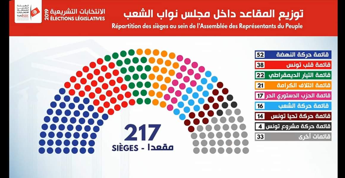 كما كان لافتًا تراجع حصة حزب الرئيس الراحل الباجي قايد السبسي من مقاعد البرلمان من 89 مقعدًا منحته الصدارة في انتخابات 2014 إلى 3 برلمانيين فقط.