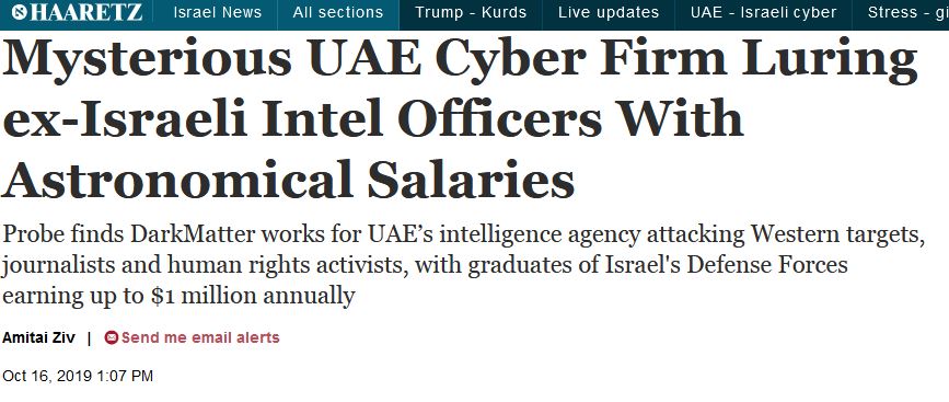 قالت صحيفة “هآرتس” العبرية، إن شركة أمنية إماراتية تستدرج ضباطًا سابقين في الاستخبارات الصهيونية للعمل لديها برواتب فلكية تصل الى مليون دولار سنويًّا.
