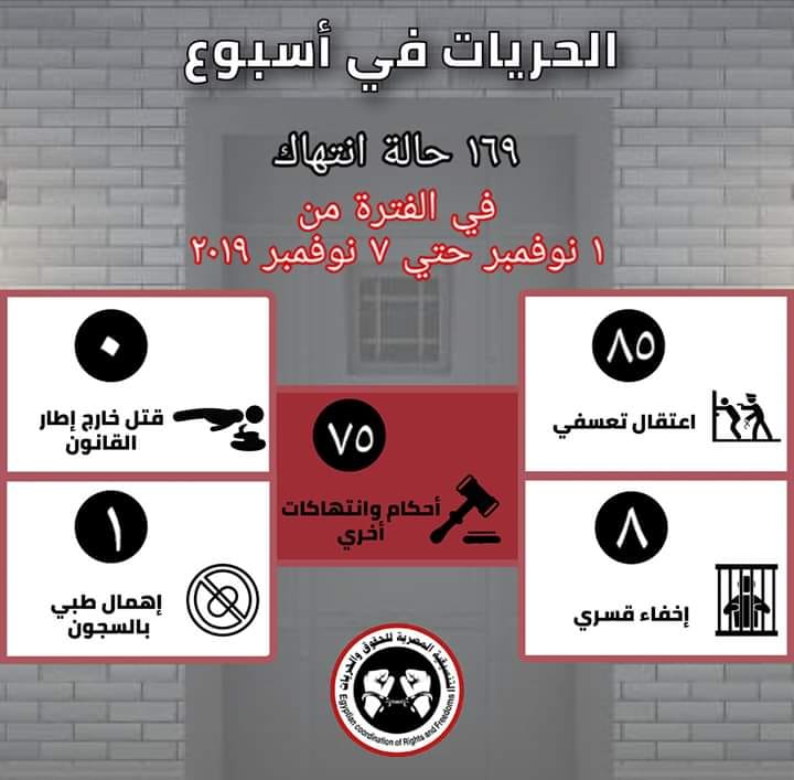 وذكرت "التنسيقية المصرية للحقوق والحريات"، عبر صفحتها على فيس بوك اليوم السبت، أن الانتهاكات خلال الأسبوع الماضي لحقوق الإنسان في مصر، وصلت إلى 169 انتهاكا خلال الفترة من يوم ١ نوفمبر حتى يوم ٧ نوفمبر ٢٠١٩.