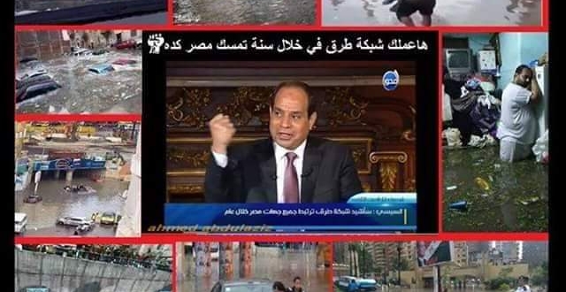 وكتب أحمد مدحت: "مليونات ايه ي فاشل اللى بتتصرف على البنيه التحتيه.، وشويه شتا قلبوا البلد كلها فوق بعضها !!!!"، فيما كتب أحمد الحسن: "ولاء السيسي للصهاينة.. وبيجوع المصريين واللي بيتكلم بيسجنه ويقتله".