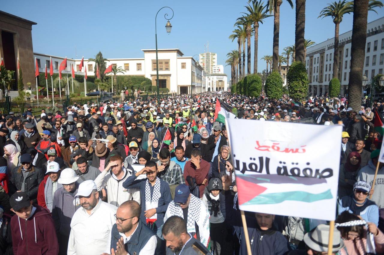 ففي المغرب، تظاهر الآلاف بالعاصمة الرباط، بدعوة من هيئات وأحزاب ونقابات مغربية، وانطلقت المسيرة التي نظمت تحت شعار “مسيرة الشعب المغربي، جميعًا من أجل فلسطين حرة، وضد صفقة العار المشئومة”، من باب “الحد التاريخي” تجاه مبنى البرلمان.