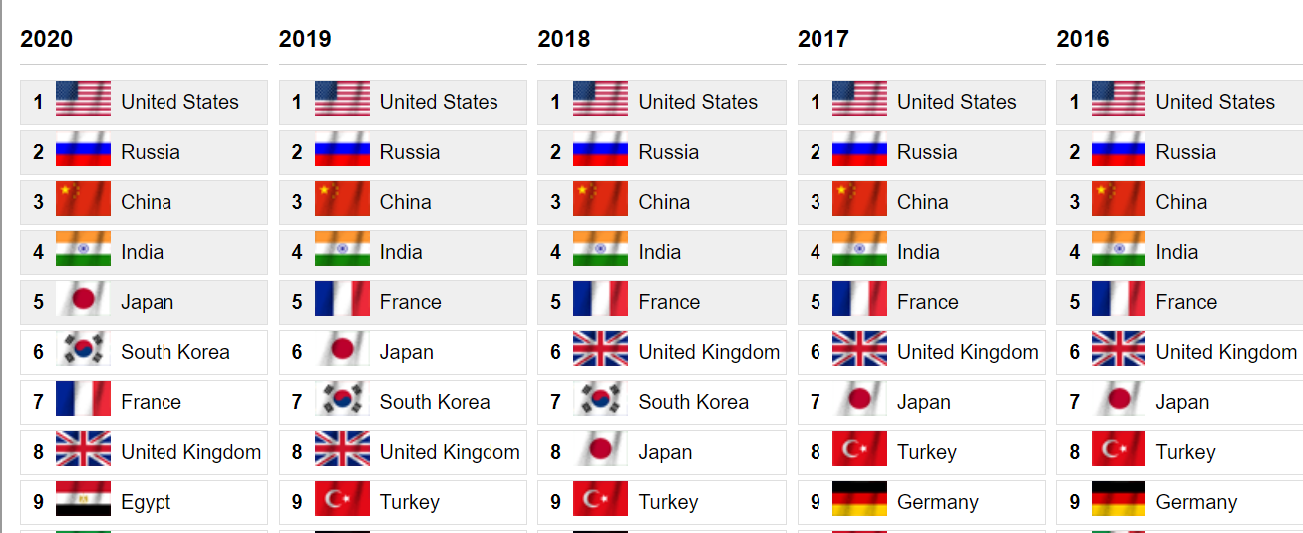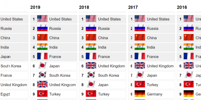 وجاء في التصنيف العالمي، وفقًا لجلوبال فاير باور، الجيش الأمريكي في المقدمة محتلا المركز الأول، بينما جاء الجيش الروسي في المركز الثاني، فيما جاء الجيش الصيني بالمركز الثالث، تلاه الجيش الهندي بالمركز الرابع، ثم الجيش الياباني في المركز الخامس، ثم كوريا الجنوبية في المركز السادس عالميًا.