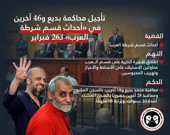 أجَّلت محكمة جنايات بورسعيد، المنعقدة بمجمع محاكم طرة، برئاسة قاضى العسكر سامي عبد الرحيم، اليوم الخميس 27 فبراير، جلسات إعادة محاكمة الأستاذ الدكتور «محمد بديع» المرشد العام للإخوان المسلمين، و46 آخرين من قيادات جماعة الإخوان، في القضية الهزلية المعروفة إعلاميا بـ«أحداث قسم شرطة العرب»، لجلسة 26 مارس المقبل، لاستكمال المرافعة.