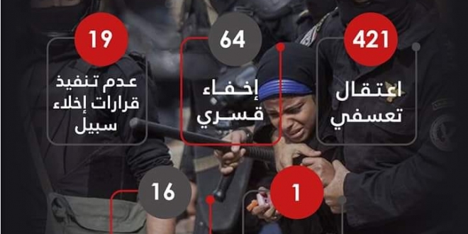 وذكرت المنظمة أن الانتهاكات تنوعت بين 421 حالة اعتقال تعسفي، و64 حالة إخفاء قسري، وحالة واحدة بالقتل بالإهمال الطبي، و16 حالة من الإهمال الطبي بالسجون، و19 حالة عدم تنفيذ قرارات إخلاء سبيل.