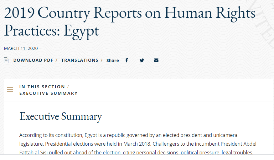 أصدرت الخارجية الأمريكية تقريرها السنوي لعام 2020 عن حقوق الإنسان في العالم، ومنها مصر، والذي يتضمن وقائع جرت في 2019، وأكدت فيه أن سلطة الانقلاب ارتكبت كل الجرائم التي ترتكبها النظم الفاشية، ولكنها ما زالت تفلت من العقاب.
