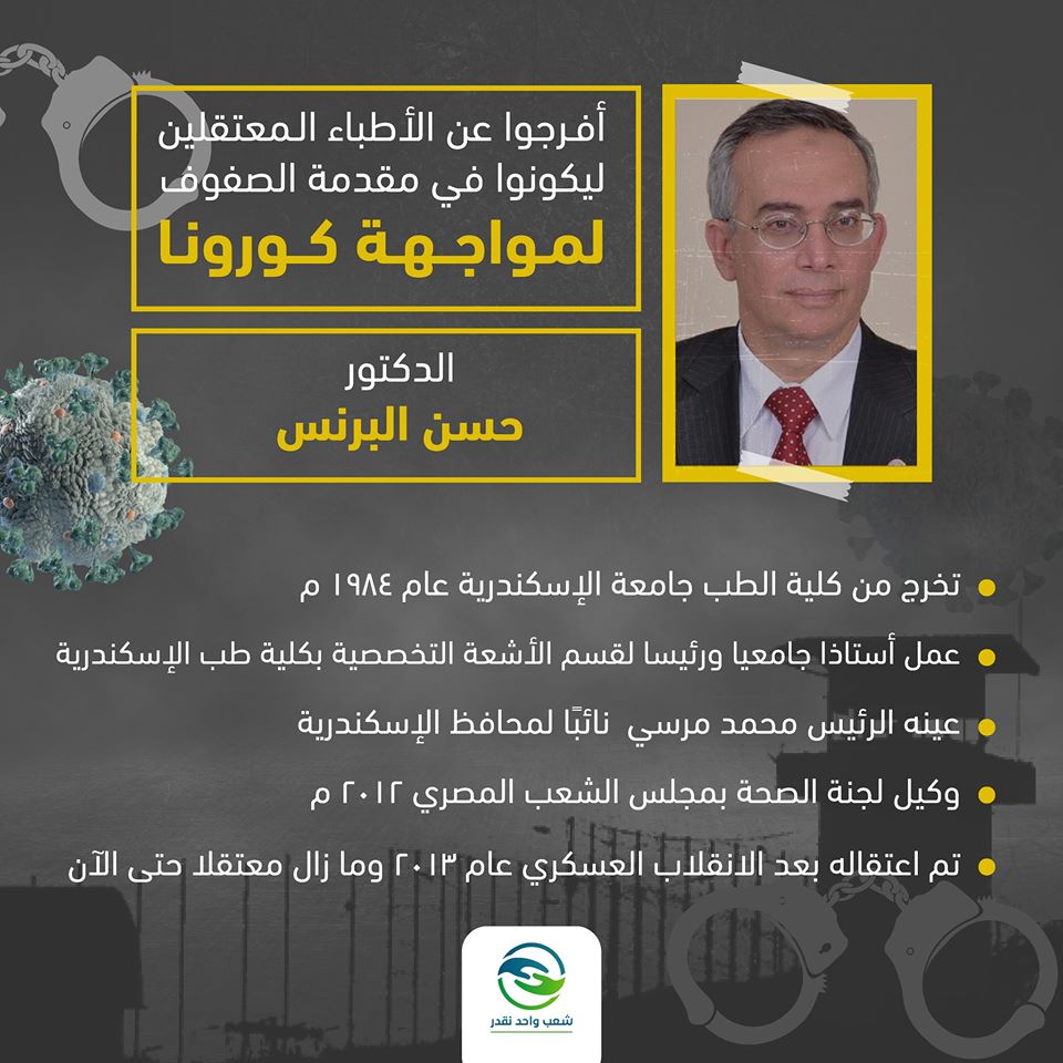 وبدأت الحملة التي تبنتها جماعة الإخوان المسلمين المطالبة بالإفراج عن الأطباء المعتقلين؛ ليكونوا في مقدمة الصفوف لمواجهة كورونا، وممن بدأت بهم الدكتور حسن البرنس والدكتور محمد البلتاجي.