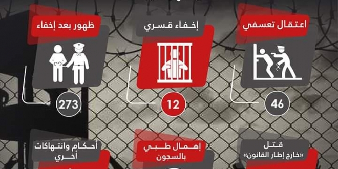 وأضافت أنها تنوعت بين 46 حالة اعتقال تعسفي، و12 حالة إخفاء قسري، و273 حالة ظهور بعد إخفاء، وحالتي إهمال طبي بالسجون، و73 حالة قتل خارج إطار القانون، و111 حالة محاكمات وانتهاكات أخرى.