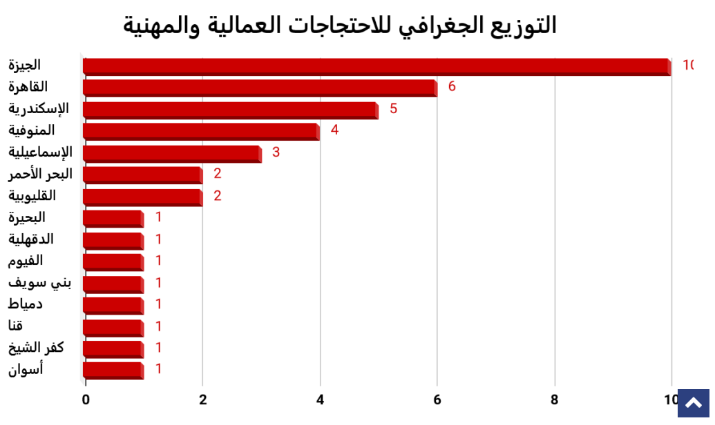 وذكر أن محافظة الجيزة تصدرت قائمة المحافظات من حيث عدد الاحتجاجات العمالية والمهنية بعدد 10 احتجاجات، وجاءت القاهرة في المركز الثاني بواقع 6 احتجاجات، وتلتها محافظة الإسكندرية بخمسة احتجاجات، ثم جاءت محافظة المنوفية بأربعة احتجاجات، وجاءت محافظة الإسماعيلية في الترتيب الخامس بثلاثة احتجاجات، وتساوت محافظتا البحر الأحمر والقليوبية في الترتيب السادس بواقع احتجاجين اثنين لكل منهما، وقبعت كل من (البحيرة، والدقهلية، والفيوم، وبني سويف، ودمياط، وقنا، وكفر الشيخ، وأسوان) في نهاية الترتيب بواقع احتجاج واحد لكل منها.