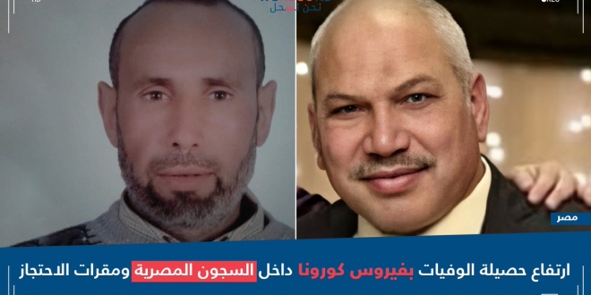 ووفق منصة "نحن نسجل" الحقوقية، فقد توفي المعتقل أحمد فتحي عامر البالغ من العمر 51 عاما، السبت، بعد إصابته بفيروس كورونا، حيث تم نقله من محبسه بسجن طره إلى مستشفى عزل العباسية بالقاهرة وتوفي داخل المستشفى، كما توفي المهندس أحمد يوسف بقسم أول العاشر من رمضان إثر إصابته بفيروس كورونا، حيث تم نقله إلى مستشفى عزل بلبيس بعد تدهور حالته، ورفضت إدارة المستشفى استقباله لعدم وجود أماكن فيها.