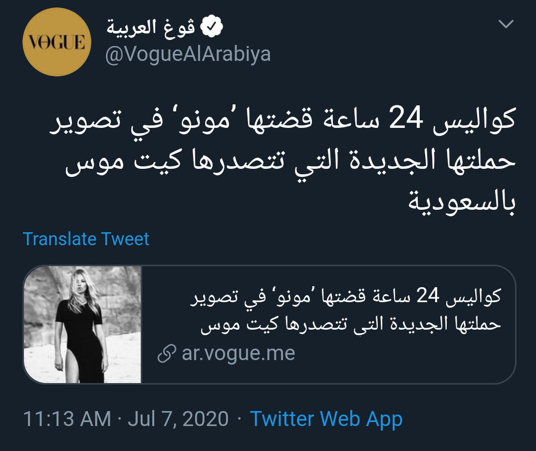 مجلة "فوغ أرابيا" النسخة العربية، والموجودة في دبي، وتتخذ من الولايات المتحدة مقرًا رئيسيا لها، نظمت جلسة تصوير أطلق عليها اسم "24 ساعة في العلا" لمشاهير مثل كيت موس، مارياكارلا بوسكونو، وكانديس سوانبويل، وجوردان دون، وأمبير فاليتا، وشياو وين، وأليك ويك.