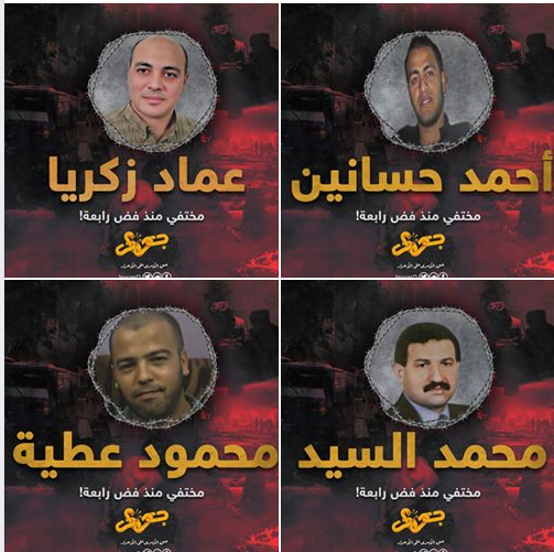 – أحمد عبد الله جمعة حسانين" مختطف من كتيبته فى الجيش بتاريخ 12 فبراير 2014، من قبل قوات أمن الجيش، قبضت عليه ولم يستدل أحد على مكانه حتى الآن.