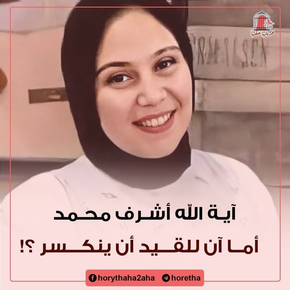 وطالبت حملة حريتها حقها  بالحرية للمعتقلة “آية الله أشرف”، تبلغ من العمر حاليا 25 عاما، خريجة صحافة وإعلام، تم اعتقالها ٤ أكتوبر ٢٠١٨ بعد تكسير أثاث المنزل والاعتداء على أشقائها بالضرب!.
