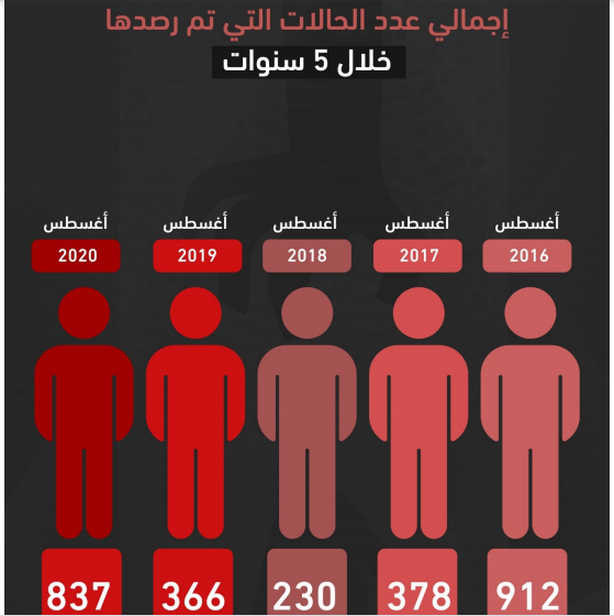 بينها 837 حالة اختفاء قسري منذ أغسطس 2019 وحتى أغسطس المنقضى 2020 يضاف إليها 912 حالة من أغسطس 2015 وحتى أغسطس 2016 و 378 حالة من أغسطس 2016 وحتى أغسطس 2017 و230 حالة من أغسطس 2017 وحتى أغسطس 2018 فضلا عن 366 حالة من أغسطس 2017 وحتى اغسطس 2019.